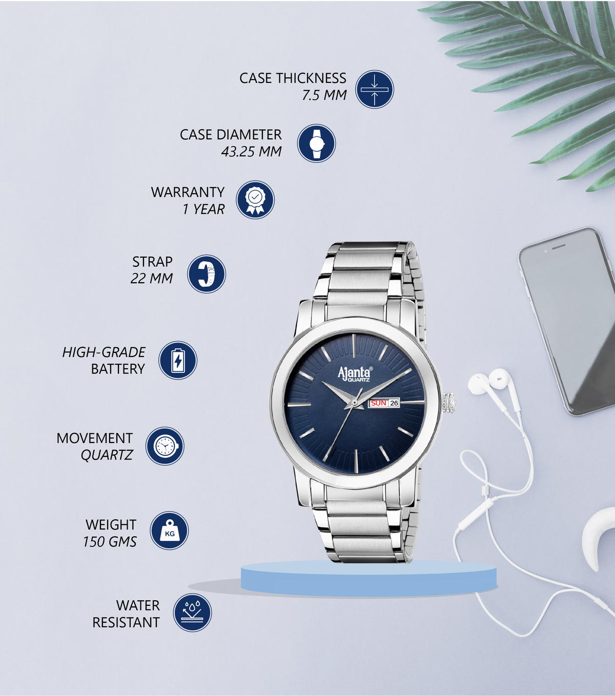 Ajanta Blue Dial Strap Watch | AWC502-5ISG/BS/SS