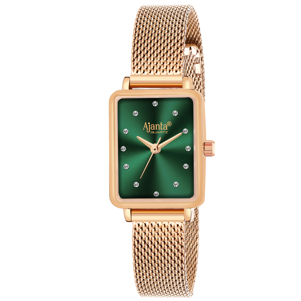 Add a touch of sophistication to your style with the Ajanta Quartz Women's Analog Watch, a perfect blend of luxury and minimalism. Featuring a rectangular green sunray dial adorned with sparkling stone hour markers, this elegant timepiece effortlessly draws attention with its refined and stylish design. The rose gold mesh strap ensures a comfortable all-day fit while adding a modern, chic appeal that complements both casual and formal outfits. Ideal for parties, office wear, or everyday styling, this versatile watch transitions seamlessly between occasions, making it a must-have accessory in every woman's collection. Crafted with precise quartz movement for accurate timekeeping, the Ajanta Quartz Women's Analog Watch combines style, functionality, and timeless elegance —designed to elevate your look and showcase your impeccable taste.