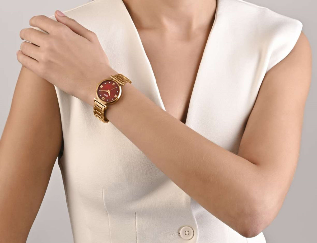 Redefine timeless elegance with the Ajanta Quartz Women’s Analog Watch, crafted for women who appreciate a perfect blend of style and sophistication. Featuring a sleek maroon sunray dial adorned with sparkling crystal-studded hour markers and elegant Roman numerals, this refined timepiece effortlessly captures attention. The rose gold metal strap adds a chic, modern touch, making it versatile enough for both formal occasions and everyday wear.