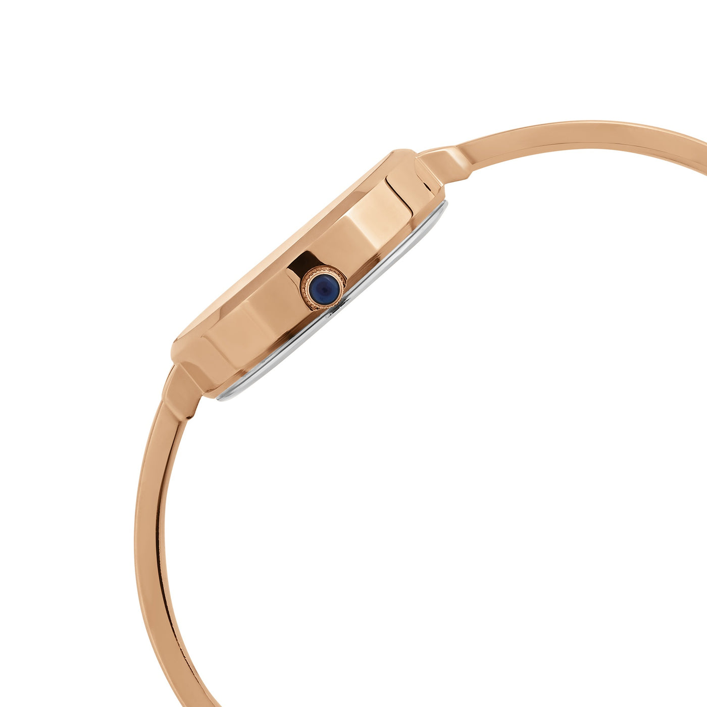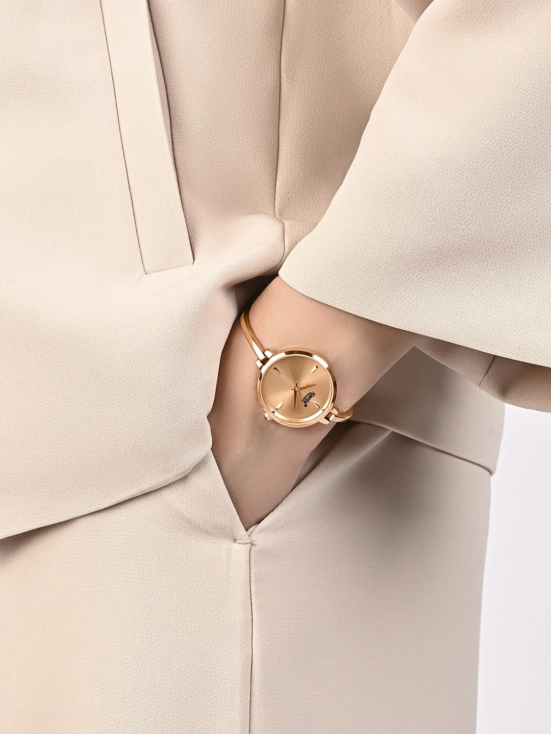 The watch features a soft rose-gold sunray dial that radiates warmth and luxury with every movement of your wrist. Its subtle metallic sheen enhances the feminine appeal while maintaining a clean and minimal look. The sleek stick indices and precisely designed hands offer clear readability, perfectly complementing the tone-on-tone design for a refined and harmonious aesthetic.