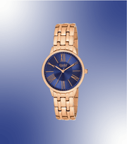 Crafted with a polished round stainless steel case, this 10mm thick timepiece pairs a rich blue dial with a refined...