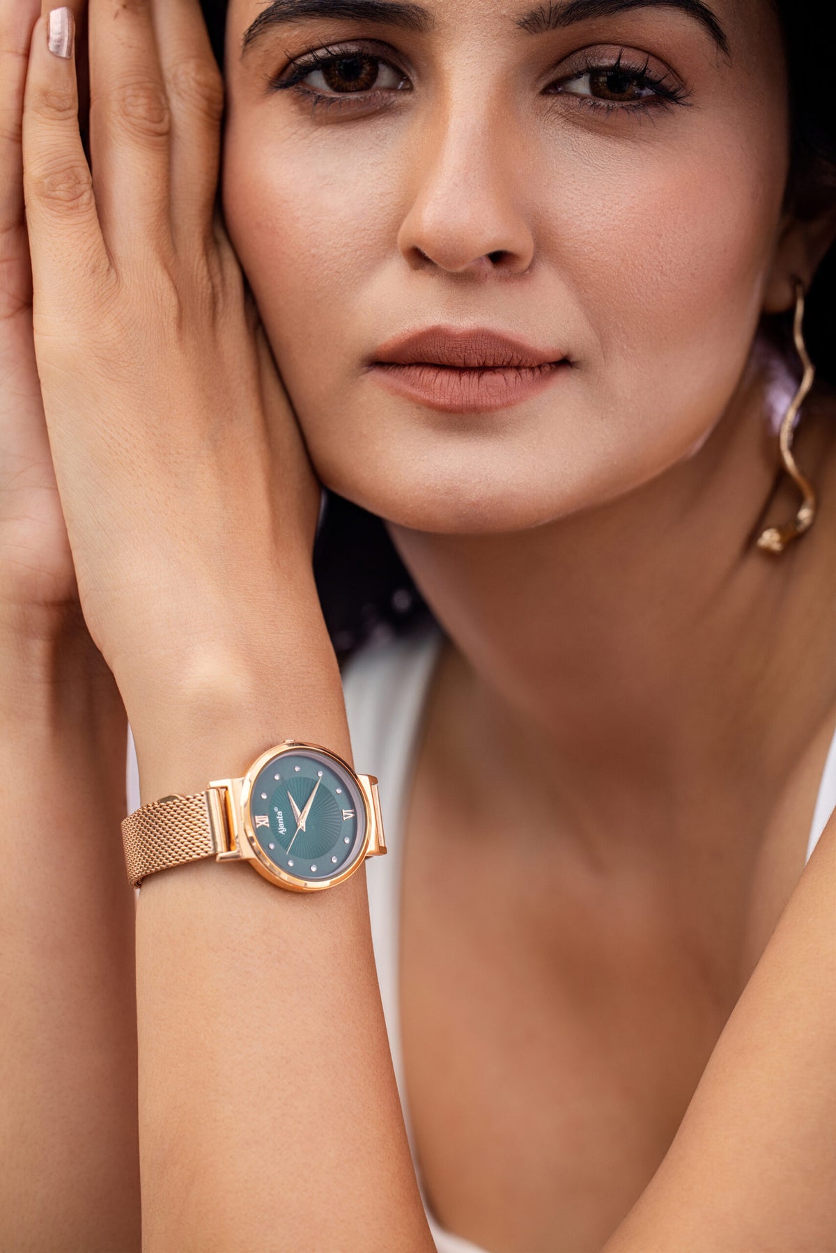 This isn’t just a watch it’s a statement. Built for women who chase legacy, not seconds, this round green-dial timepiece...