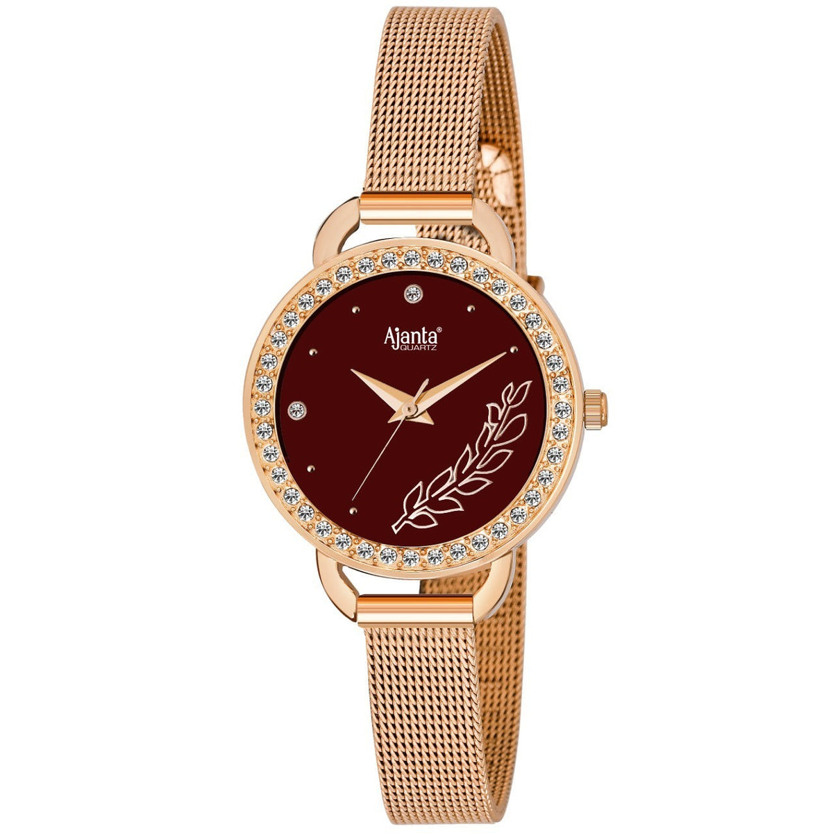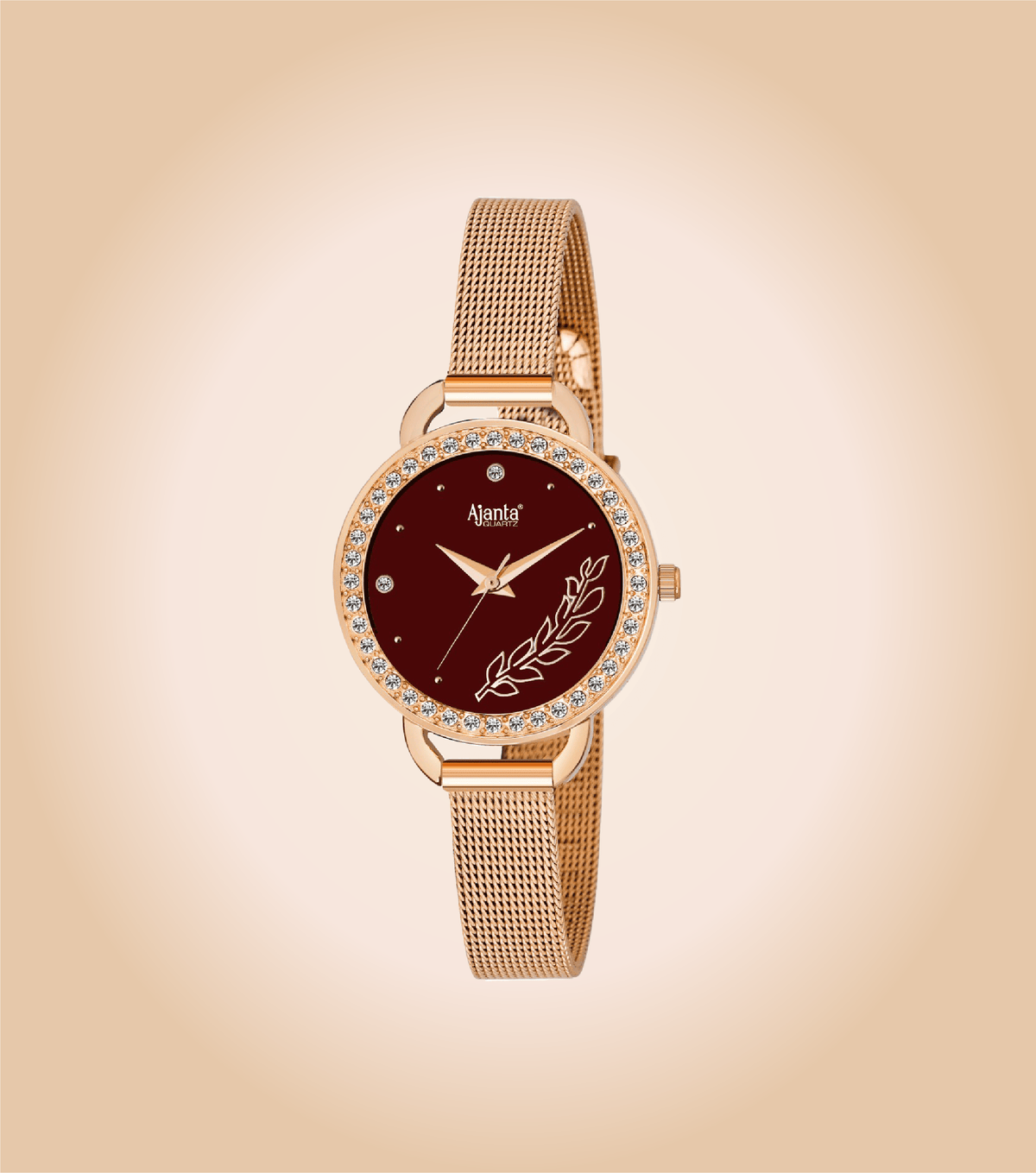 Step into elegance with the Ajanta Quartz Women’s Analog Watch, designed for modern women who appreciate timeless sophistication. Featuring a sleek maroon sunray dial adorned with a delicate leaf motif, this exquisite timepiece is enhanced with sparkling crystal accents on both the dial and bezel, adding a touch of refined luxury. The slim rose gold mesh strap provides a contemporary and stylish look while ensuring a lightweight and comfortable fit for all-day wear. Perfect for office wear, parties, or casual outings, this versatile watch effortlessly complements both modern and traditional outfits. The Ajanta Quartz Women’s Analog Watch combines style, precision, and elegance—making it a must-have accessory that elevates your everyday look with grace and charm.