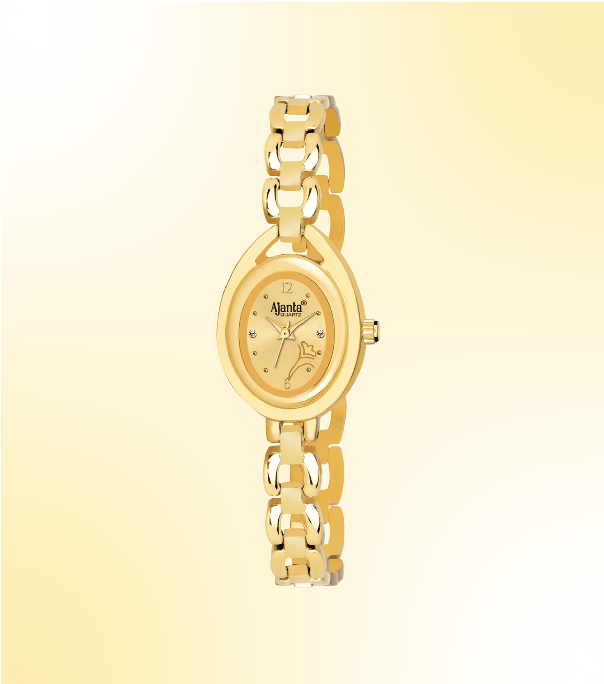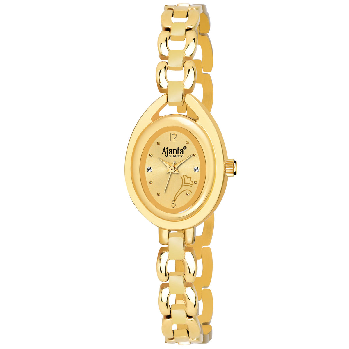 Add a royal charm to your look with the Ajanta Quartz Women's Analog Watch, designed to blend tradition with modern elegance. Featuring a deep gold oval dial enhanced with delicate crystal markers and a unique designer motif, this timepiece stands out with its artistic detailing. The polished gold-tone case and linked bracelet strap give it a luxurious finish, making it perfect for festive occasions, parties, and special celebrations.