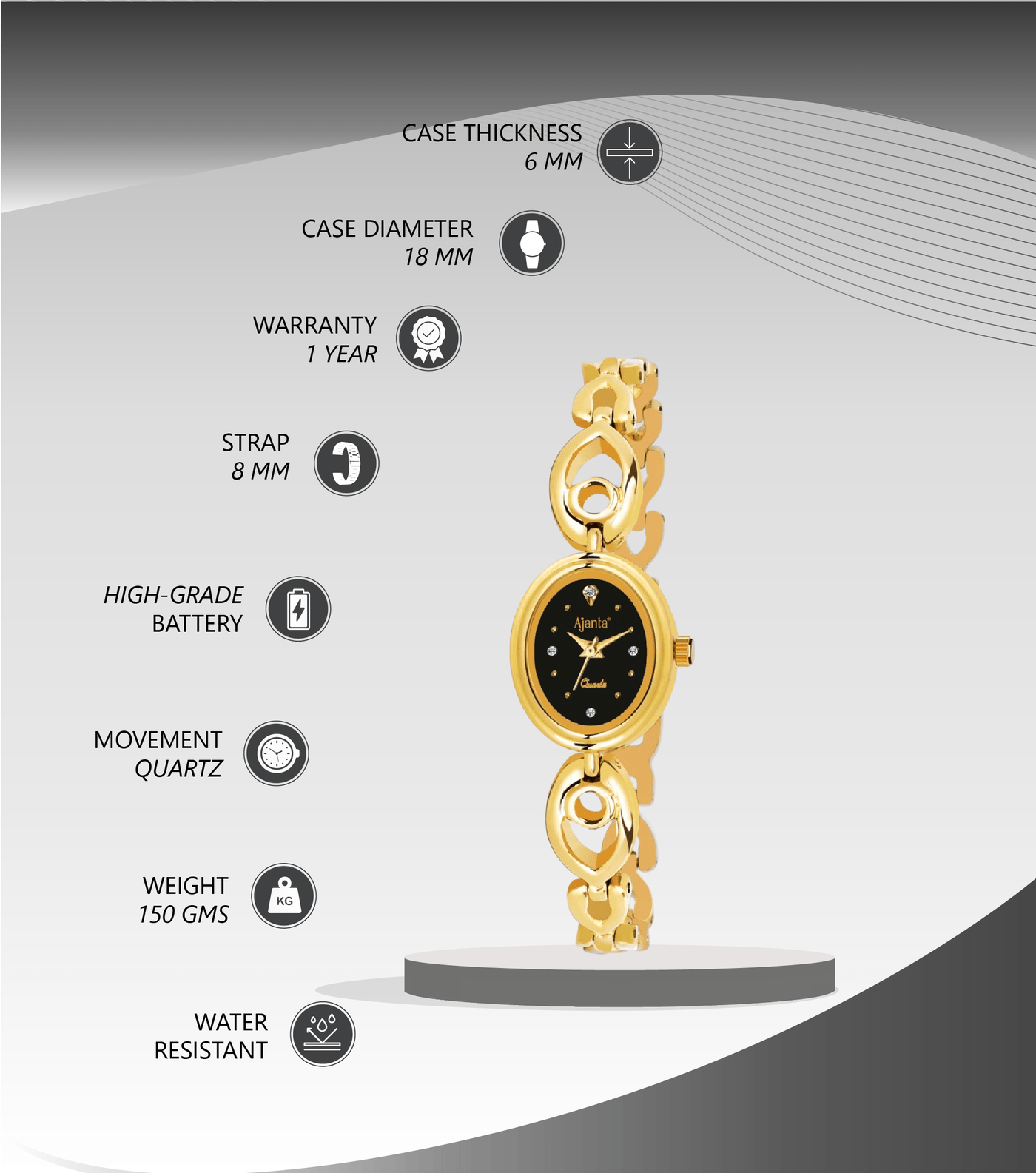 Ajanta Gold Women’s Watch – Black Oval Dial | AWC411MRL/1