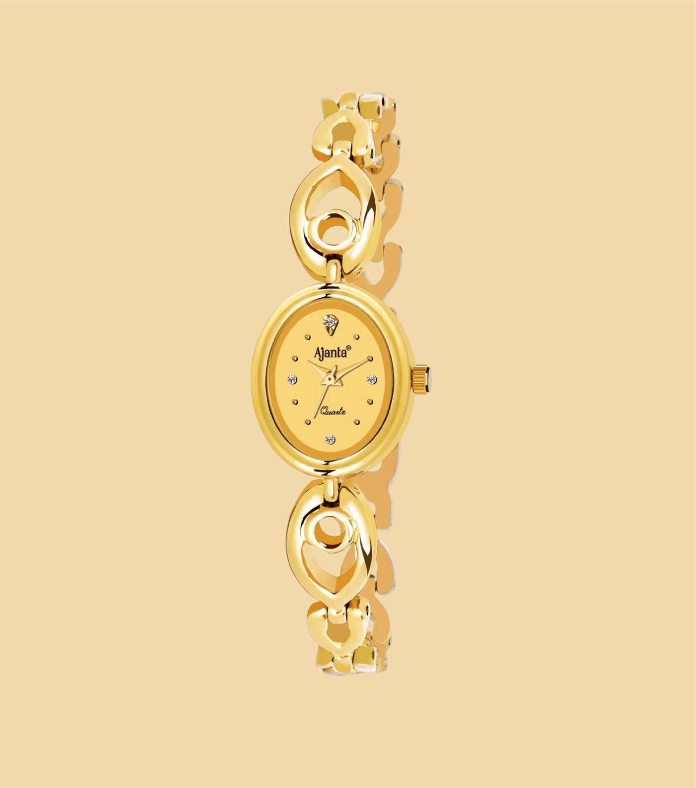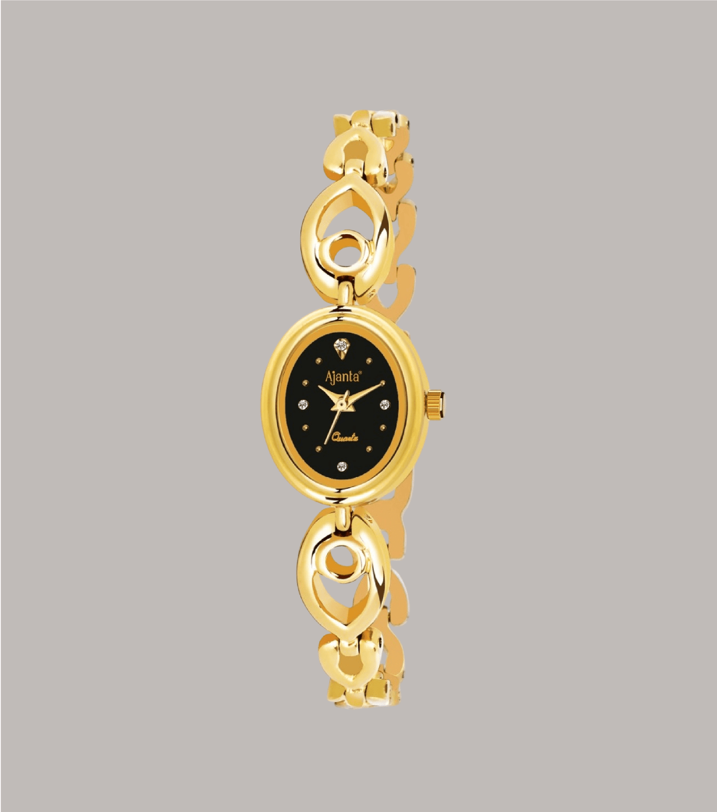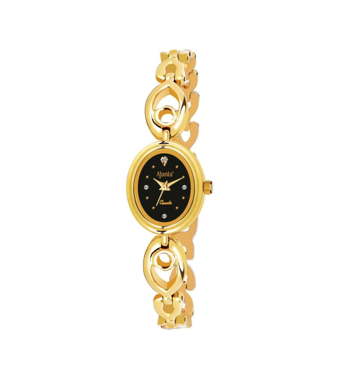 Add a touch of timeless elegance to your wrist with the Ajanta Quartz Women’s Analog Watch. Featuring a sleek black oval dial embellished with sparkling stone markers, this watch exudes sophistication. The beautifully crafted golden bracelet strap with designer cut-outs makes it a perfect accessory for parties, weddings, or everyday glam. Designed with precision quartz movement, this watch ensures style and accuracy go hand in hand.