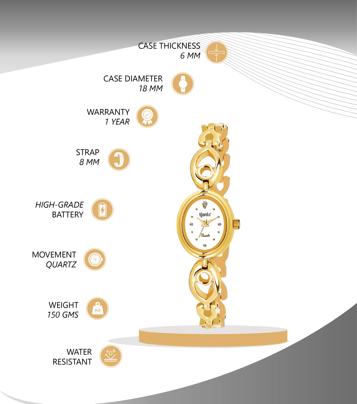 Ajanta Gold Women’s Watch – White Oval Dial | AWC411MRL/2